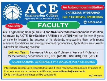 ACE Engineering College, an NBA and NAAC accredited Autonomous Institution, has been shaping the success stories of students for over 18 years. Recognized under the UGC-LITE-50 program, we are dedicated to fostering excellence in education. We invite applications for the following positions to inspire and guide our students towards achieving their goals.